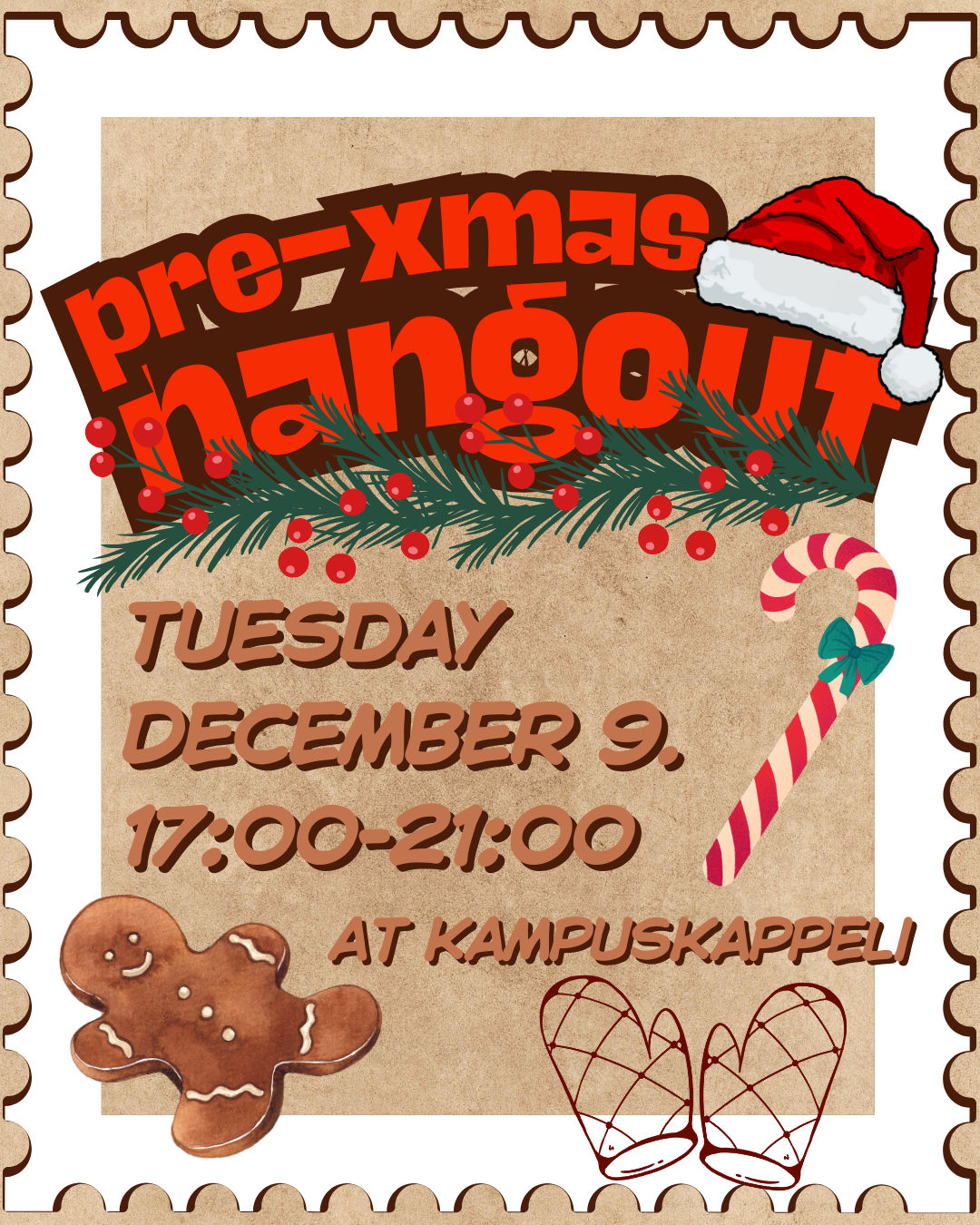 Hybridi’s international and social policy responsibles are organising a relaxing pre-xmas hangout evening together with ESN Uni Turku on 9.12. at 17 o’clock! The hangout evening will be at Kampuskappeli and the purpose of this event is to promote your wellbeing. Everyone is welcome to join🫶🏻