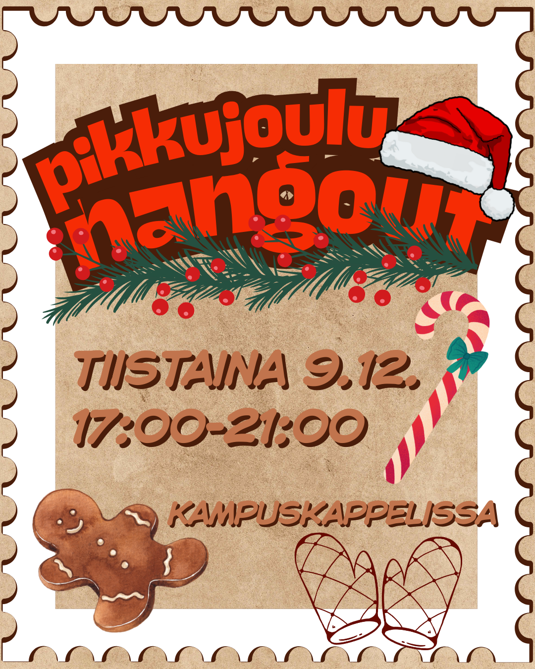 Tässä tapahtumassa voit nollata pääsi tenteistä ja arkistressistä leipomalla pipareita, pelaamalla lautapelejä, ompelemalla haalarimerkkejä tai ihan vaan hengailemalla! Tarjolla on leivotut piparit sekä hieman juotavaa.