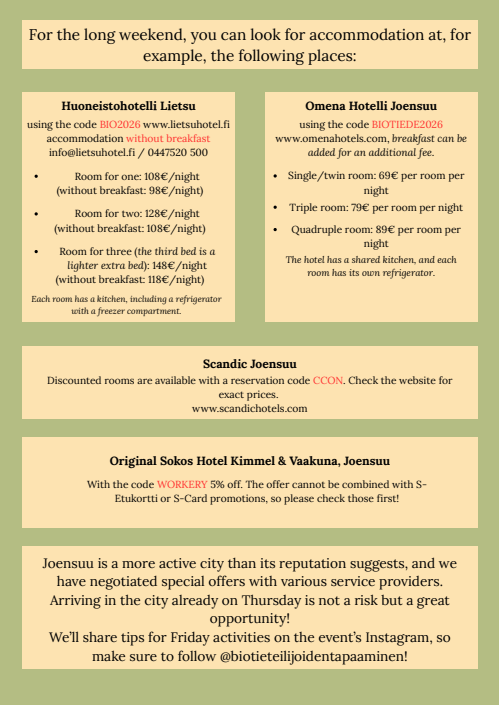Hei, ja tervetuloa viettämään unohtumatonta vuoden 2026 Biotieteilijöiden tapaamista Itä-Suomeen ja Joensuuhun!